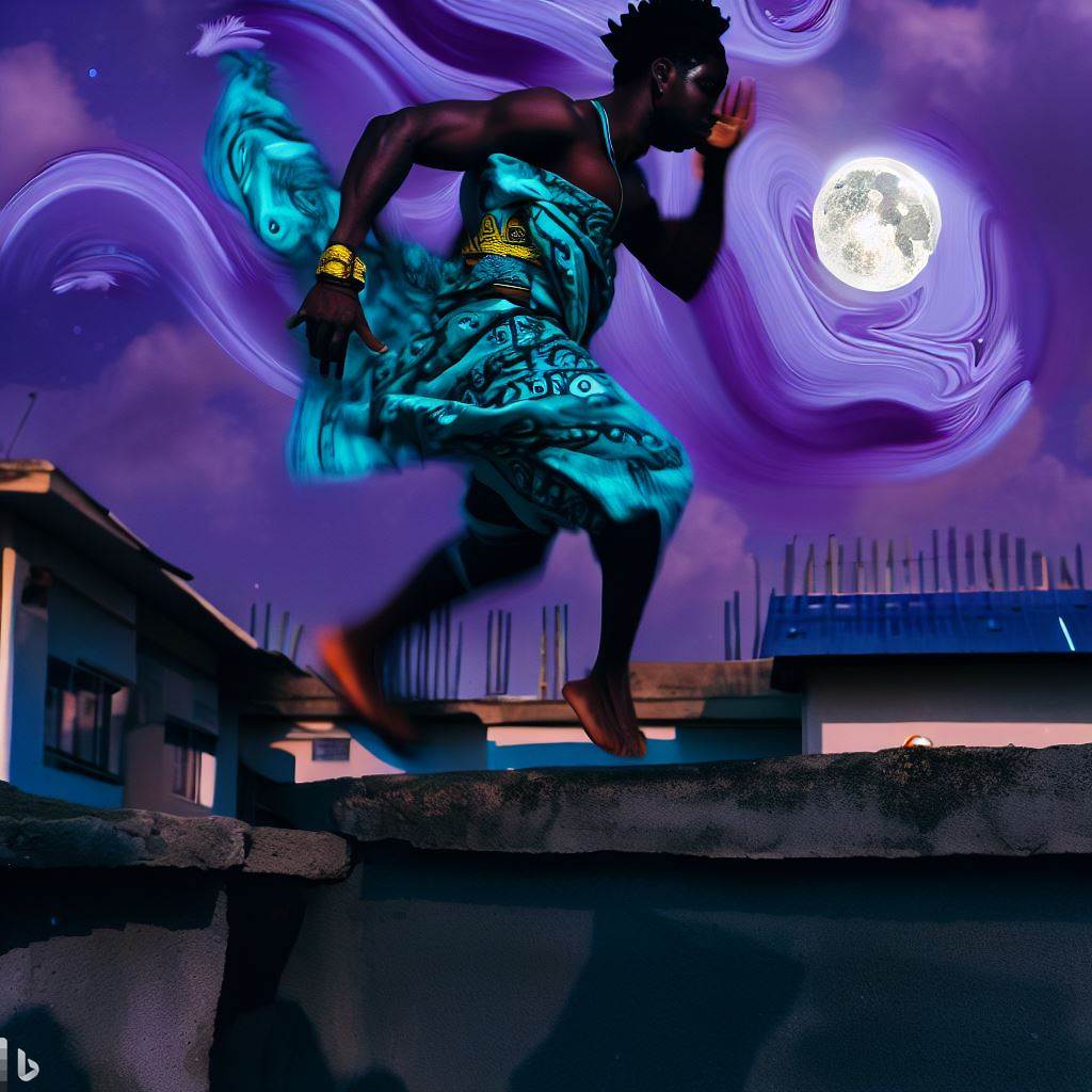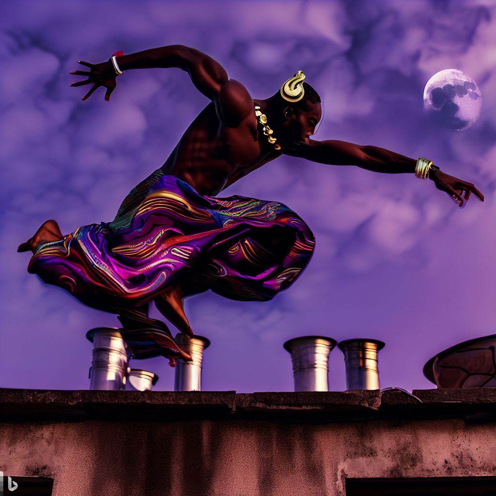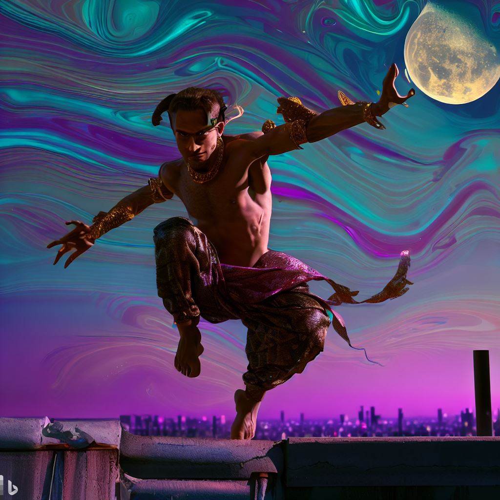 A man wearing loindrapes and gold earcuffs, jumping from rooftop to rooftop. the moon is in the sky and casts oily swirls of amethyst and aquamarine
