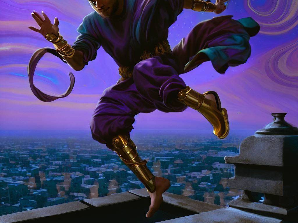 A man wearing loindrapes and gold earcuffs, jumping from rooftop to rooftop. the moon is in the sky and casts oily swirls of amethyst and aquamarine