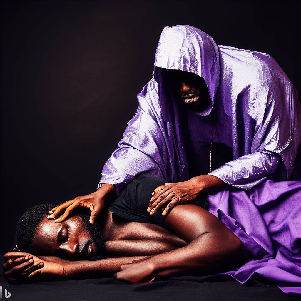 A man dressed in a cloak places his hand on a sleeping man. This represents the work of Ehiru the Gatherer.